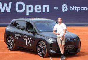 (250420) -- MUNICH, 20 abril, 2025 (Xinhua) -- Alexander Zverev festeja durante la ceremonia de premiación después de la final...