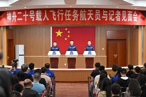 (250423) -- JIUQUAN, 23 abril, 2025 (Xinhua) -- Una conferencia de prensa sobre la misión tripulada de vuelo espacial Shenzhou-20...