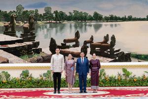 (250423) -- PHNOM PENH, 23 abril, 2025 (Xinhua) -- El primer ministro camboyano, Hun Manet (2-d), y la visitante primera...