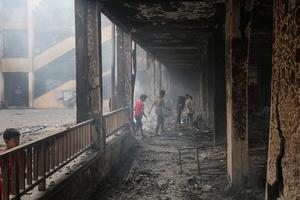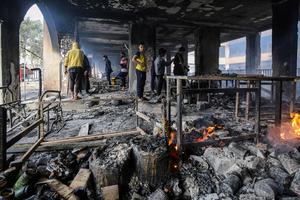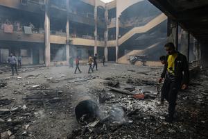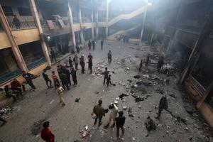 (250423) -- GAZA, 23 abril, 2025 (Xinhua) -- Palestinos son vistos en una escuela tras un ataque aéreo israelí, en...