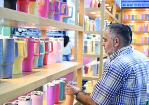 (250423) -- GUANGZHOU, 23 abril, 2025 (Xinhua) -- Un comprador extranjero observa productos de botellas de agua durante la 137ª...