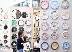(250423) -- GUANGZHOU, 23 abril, 2025 (Xinhua) -- Compradores extranjeros conversan en un área de relojes durante la 137ª Feria...
