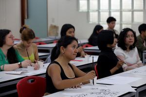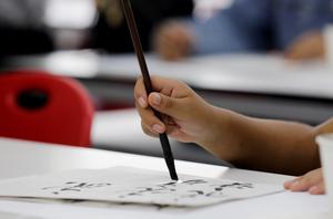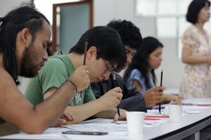 (250423) -- LIMA, 23 abril, 2025 (Xinhua) -- Imagen del 22 de abril de 2025 de alumnos realizando trazos en...