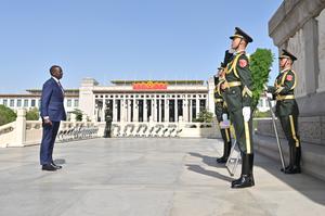 (250423) -- BEIJING, 23 abril, 2025 (Xinhua) -- El presidente keniano, William Ruto, deposita una ofrenda floral en el Monumento...
