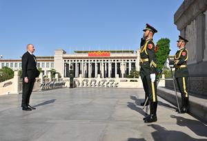 (250423) -- BEIJING, 23 abril, 2025 (Xinhua) -- El presidente azerbaiyano, Ilham Aliyev, deposita una ofrenda floral en el Monumento...