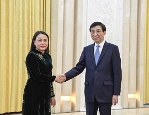 (250424) -- BEIJING, 24 abril, 2025 (Xinhua) -- Wang Huning, presidente del Comité Nacional de la Conferencia Consultiva Política del Pueblo Chino (CCPPCh), también miembro del Comité Permanente del Buró Político del Comité Central del Partido Comunista de China (PCCh), se reúne con Nguyen Thi Thu Ha, vicepresidenta y secretaria general del Comité Central del Frente de la Patria de Vietnam (FPV), también integrante del Comité Central del Partido Comunista de Vietnam, en Beijing, capital de China, el 24 de abril de 2025. (Xinhua/Zhang Ling) (jg) (ah) (ce)