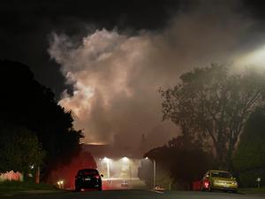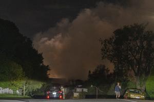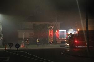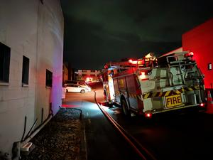 (250424) -- AUCKLAND, 24 abril, 2025 (Xinhua) -- Camiones de bomberos son vistos cerca del sitio de un incendio masivo,...