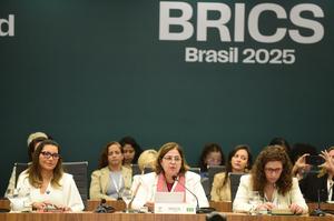 (250424) -- BRASILIA, 24 abril, 2025 (Xinhua) -- La ministra de la Mujer de Brasil, Aparecida Goncalves (c), habla junto...