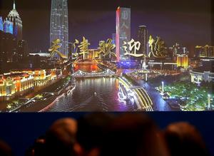 (250424) -- LONDRES, 24 abril, 2025 (Xinhua) -- Personas observan un video promocional de la ciudad portuaria de Tianjin, en...