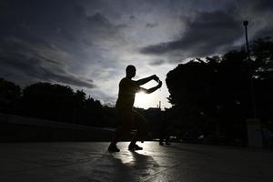 (250424) -- YAKARTA, 24 abril, 2025 (Xinhua) -- Un hombre practica Baduanjin, un ejercicio aeróbico tradicional chino, en Yakarta, Indonesia,...