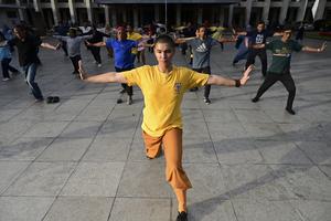 (250424) -- YAKARTA, 24 abril, 2025 (Xinhua) -- Personas practican Baduanjin, un ejercicio aeróbico tradicional chino, en Yakarta, Indonesia, el...