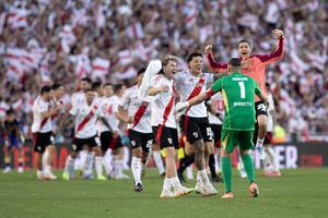 (250427) -- BUENOS AIRES, 27 abril, 2025 (Xinhua) -- Jugadores de River Plate festejan la victoria al término del partido correspondiente...