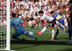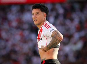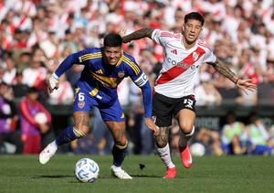 (250427) -- BUENOS AIRES, 27 abril, 2025 (Xinhua) -- El jugador Sebastián Driussi (i), de River Plate, disputa el balón con...