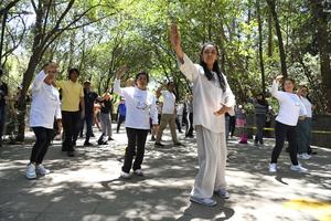 (250427) -- CIUDAD DE MEXICO, 27 abril, 2025 (Xinhua) -- Miriam Gloria H. (frente), instructora de Tai Chi, participa en...