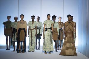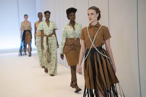 (250426) -- JOHANNESBURGO, 26 abril, 2025 (Xinhua) -- Imagen del 25 de abril de 2025 de modelos presentando creaciones durante...