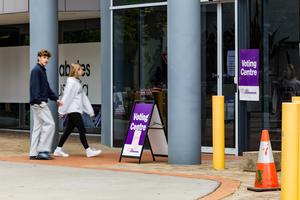 (250426) -- CANBERRA, 26 abril, 2025 (Xinhua) -- Personas ingresan a un centro de votación para la elección general de...