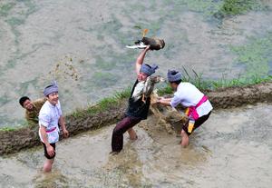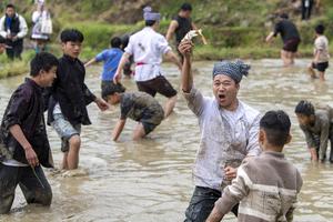 (250426) -- CONGJIANG, 26 abril, 2025 (Xinhua) -- Aldeanos participan en una actividad de captura de patos durante un evento...