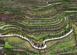 (250426) -- CONGJIANG, 26 abril, 2025 (Xinhua) -- Vista aérea tomada con un dron de aldeanos participando en un evento...