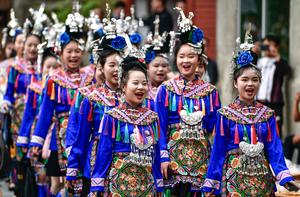 (250426) -- CONGJIANG, 26 abril, 2025 (Xinhua) -- Niñas portando trajes étnicos participan en un evento cultural, en el distrito...