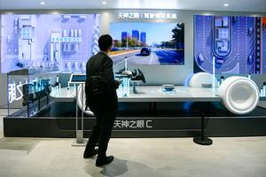 (250425) -- SHANGHAI, 25 abril, 2025 (Xinhua) -- Un visitante aprende sobre un sistema de asistencia de conducción de BYD...