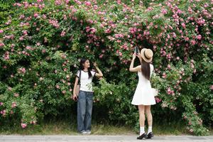 (250425) -- XI'AN, 25 abril, 2025 (Xinhua) -- Personas toman fotografías con flores en un parque, en Xi'an, en la...