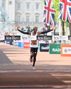 (250427) -- LONDRES, 27 abril, 2025 (Xinhua) -- Sabastian Sawe, de Kenia, cruza la línea de meta durante la carrera...