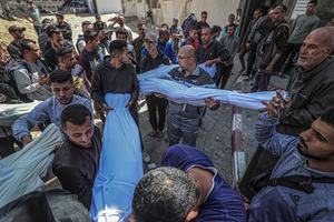(250427) -- GAZA, 27 abril, 2025 (Xinhua) -- Imagen del 26 de abril de 2025 de palestinos cargando cuerpos de...