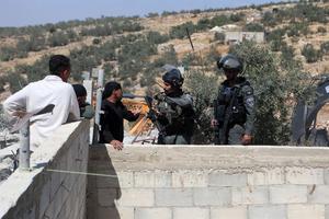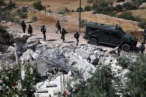 (250428) -- HEBRON, 28 abril, 2025 (Xinhua) -- Fuerzas israelíes son vistas después de que excavadoras israelíes demolieran casas, en...