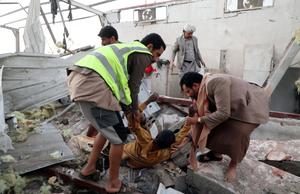 (250428) -- SANA, 28 abril, 2025 (Xinhua) -- Captura de pantalla de un video que muestra a rescatistas ayudando a...
