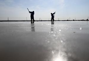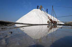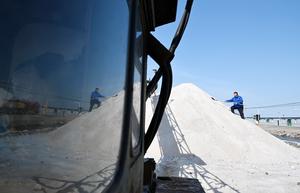 (250428) -- TIANJIN, 28 abril, 2025 (Xinhua) -- Imagen del 27 de abril de 2025 de trabajadores empacando sal cosechada...