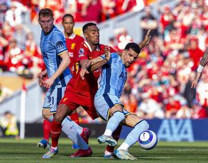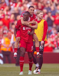 (250428) -- LIVERPOOL, 28 abril, 2025 (Xinhua) -- Imagen del 27 de abril de 2025 de Ibrahima Konate (i-abajo) y...