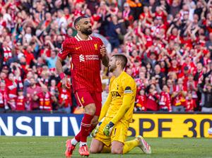 (250428) -- LIVERPOOL, 28 abril, 2025 (Xinhua) -- Imagen del 27 de abril de 2025 de Mohammed Salah, de Liverpool,...