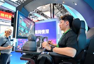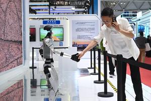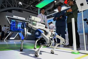 (250428) -- FUZHOU, 28 abril, 2025 (Xinhua) -- Un empleado opera un perro robot en la zona de experiencias de...