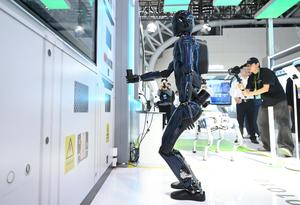(250428) -- FUZHOU, 28 abril, 2025 (Xinhua) -- Un empleado demuestra la operación de un robot en la zona de...