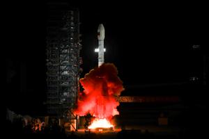 (250428) -- XICHANG, 28 abril, 2025 (Xinhua) -- Imagen del 27 de abril de 2025 de un cohete portador Gran...