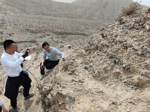 (250429) -- LANZHOU, 29 abril, 2025 (Xinhua) -- Imagen del 19 de abril de 2025 de un equipo de investigación arqueológica estudiando una sección de la Gran Muralla, en el distrito de Jingyuan en la ciudad de Baiyin, en la provincia de Gansu, en el noroeste de China. Nueve secciones de la Gran Muralla, que se cree que datan de hace más de 2000 años, han sido descubiertas en la provincia de Gansu, en el noroeste de China, de acuerdo con arqueólogos locales. Fueron halladas en el distrito de Jingyuan, en la ciudad de Baiyin, y basándose en características como el grosor de las capas de tierra apisonada, los arqueólogos inicialmente concluyeron que las paredes fueron construidas durante la dinastía Qin (221 a. C.-207 a. C.). (Xinhua) (jg) (ra) (vf)