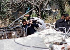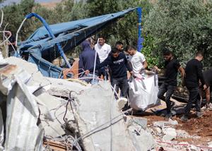 (250429) -- RAMALLAH, 29 abril, 2025 (Xinhua) -- Un palestino retira objetos después de que excavadoras israelíes demolieran un edificio...