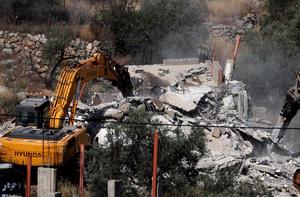 (250429) -- RAMALLAH, 29 abril, 2025 (Xinhua) -- Una excavadora israelí demuele un edificio palestino, en la aldea de Qibya,...
