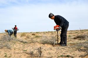 (250429) -- ORDOS, 29 abril, 2025 (Xinhua) -- Imagen del 28 de abril de 2025 de trabajadores plantando salix mongolia,...