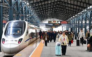 (250429) -- BEIJING, 29 abril, 2025 (Xinhua) -- Pasajeros abordan un tren en la Estación de Ferrocarril de Yangzhou, en...