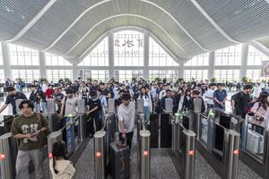 (250429) -- BEIJING, 29 abril, 2025 (Xinhua) -- Pasajeros se registran en la Estación de Ferrocarril de Lishui, en la...