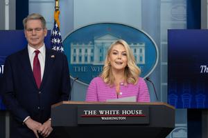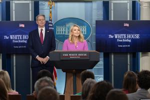 (250429) -- WASHINGTON, 29 abril, 2025 (Xinhua) -- La secretaria de Prensa de la Casa Blanca, Karoline Leavitt (c), habla...