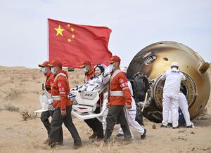 (250430) -- SITIO DE ATERRIZAJE DONGFENG, 30 abril, 2025 (Xinhua) -- La astronauta Wang Haoze sale de la cápsula de...