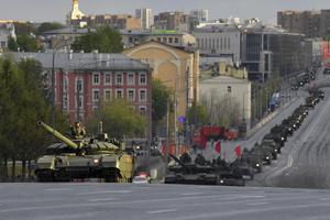 (250430) -- MOSCU, 30 abril, 2025 (Xinhua) -- Imagen del 29 de abril de 2025 de vehículos militares circulando a...