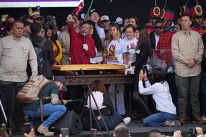 (250501) -- BOGOTA, 1 mayo, 2025 (Xinhua) -- El presidente colombiano, Gustavo Petro (c), sostiene la espada del Libertador, Simón...
