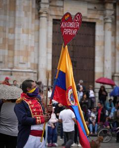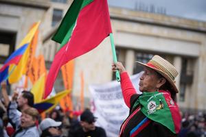 (250501) -- BOGOTA, 1 mayo, 2025 (Xinhua) -- Una mujer perteneciente a una comunidad indígena sostiene una bandera durante una...