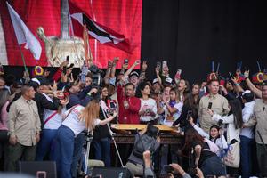 (250501) -- BOGOTA, 1 mayo, 2025 (Xinhua) -- El presidente colombiano, Gustavo Petro (c), pronuncia un discurso durante una marcha...
