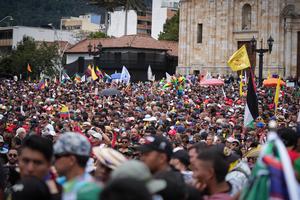 (250501) -- BOGOTA, 1 mayo, 2025 (Xinhua) -- Personas participan durante una marcha por el Día Internacional de los Trabajadores,...