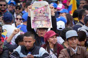 (250501) -- BOGOTA, 1 mayo, 2025 (Xinhua) -- Una mujer sostiene una pancarta durante una marcha por el Día Internacional...
