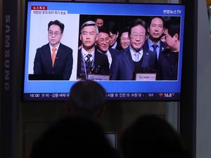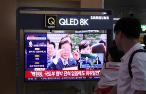 (250501) -- SEÚL, 1 mayo, 2025 (Xinhua) -- Personas ven las noticias sobre Lee Jae-myung en una televisión, en la...